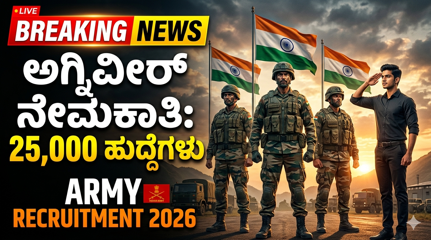 ಭಾರತೀಯ ಸೇನೆ Agniveer Recruitment 2026 ಗೆ ಸಂಬಂಧಿಸಿದಂತೆ ಅಧಿಕೃತ ನೋಟಿಫಿಕೇಶನ್ ಬಿಡುಗಡೆ ಮಾಡಿದೆ. ಈ ನೇಮಕಾತಿಯ ಮೂಲಕ ಸುಮಾರು 25,000ಕ್ಕೂ ಹೆಚ್ಚು ಹುದ್ದೆಗಳನ್ನು ಭರ್ತಿ ಮಾಡಲು ನಿರ್ಧರಿಸಲಾಗಿದೆ.
